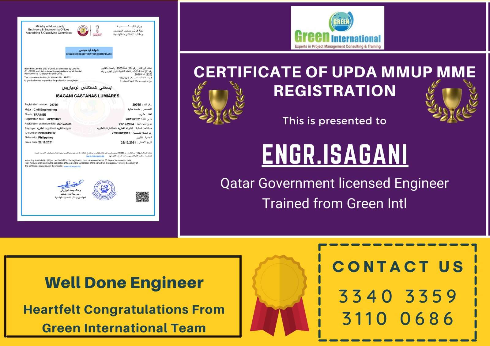 We would like to announce the launching of a Computer-based UPDA MMUP EXAM SIMULATION PRACTICE CENTER in Doha, Qatar. As you are familiar, Green International is a Leading, Pioneer, and High Success Rated training provider in Qatar Since 2013 supporting the Engineers working in Qatar with customized UPDA Civil Exam Syllabus, rigorous coaching, high-quality study materials, and online mock tests using Qatar MMUP Civil Engineer Exam Questions.